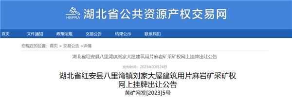 湖北省公共資源交易中心于4月23日還將掛牌另一宗砂石礦采礦權——湖北省紅安縣大山崗礦區片麻巖礦。該礦資源儲量4110.48萬噸,年生產規模300萬噸,出讓年限14年(含基建期1.2年),起始價6465.36萬元。掛牌時間2023年4月23日至2023年5月8日。