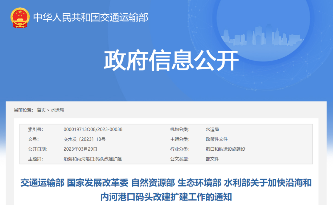 交通運輸部 國家發展改革委 自然資源部 生態環境部 水利部關于加快沿海和內河港口碼頭改建擴建工作的通知交水發〔2023〕18號