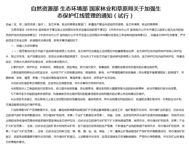 2022年8月,自然資源部、生態環境部、國家林業和草原局聯合印發《關于加強生態保護紅線管理的通知(試行)》(自然資發〔2022〕142號,下稱142號文),明確提出:在符合法律法規的前提下,允許包括“地質調查與礦產資源勘查開采”等對生態功能不造成破壞的有限人為活動。