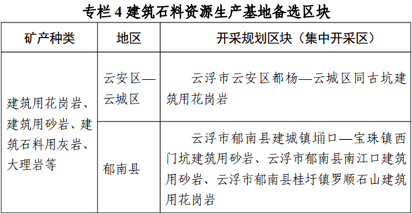 沿江區域:包括郁南縣平臺鎮、桂圩鎮、寶珠鎮、南江口鎮、云安區六都鎮、都楊鎮、云城區同古坑等區域,重點安排4處建筑石料集中開采區,構建區域聯動、供需平衡、綠色環保、集約發展的建筑石料開發格局,重點保障粵港澳大灣區工程建設。