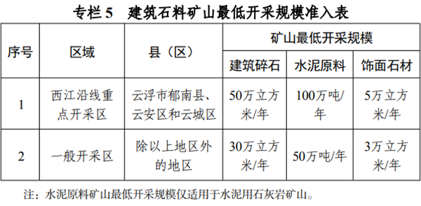 新建礦山應在達到最低生產建設規模要求的基礎上,與資源儲量相匹配,實行規模開發、集約節約開發。最低生產建設規模參照省級規劃設定礦山最低開采規模執行外,對建筑石料礦山的最低生產建設規模參照專欄5執行。