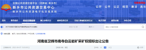 4月7日,河南省新鄉市公共資源交易中心發布了河南省衛輝市南寺白云巖礦采礦權招標出讓公告。該礦招標控制價162454.47萬元(16.24億元),投標報價低于招標控制價的投標無效。本次招標不接受自然人投標和聯合體投標。
