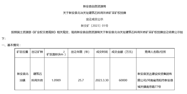 其中,洛陽新安縣北冶關址建筑石料礦儲量超2億噸、年產800萬噸、出讓年限25.7年。該礦被當地國企新安縣發達建設投資集團有限公司競得,成交價6億元。
