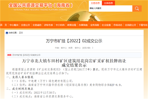2022年12月30日,中電建(萬寧)綠色建材有限公司最終以7.12億元成功競得海南省萬寧市北大鎮車田村礦區建筑用花崗巖礦采礦權。根據公告,礦區資源儲量3341.08萬方,年產151.63萬方(建筑用花崗巖130萬方/年、剝離物21.63萬方/年),出讓年限20年。