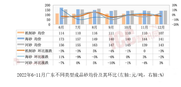 但受新冠疫情等的影響,2022年下半年海砂價(jià)格有降低趨勢(shì),8月-12月份海砂價(jià)格略有波動(dòng),總體上較為平穩(wěn)。2022年廣東省成品海砂均價(jià)240元/方。另根據(jù)市場(chǎng)調(diào)研,2022年年底粵西地區(qū)回填海砂價(jià)格約130元/方(坑口不含稅價(jià))。