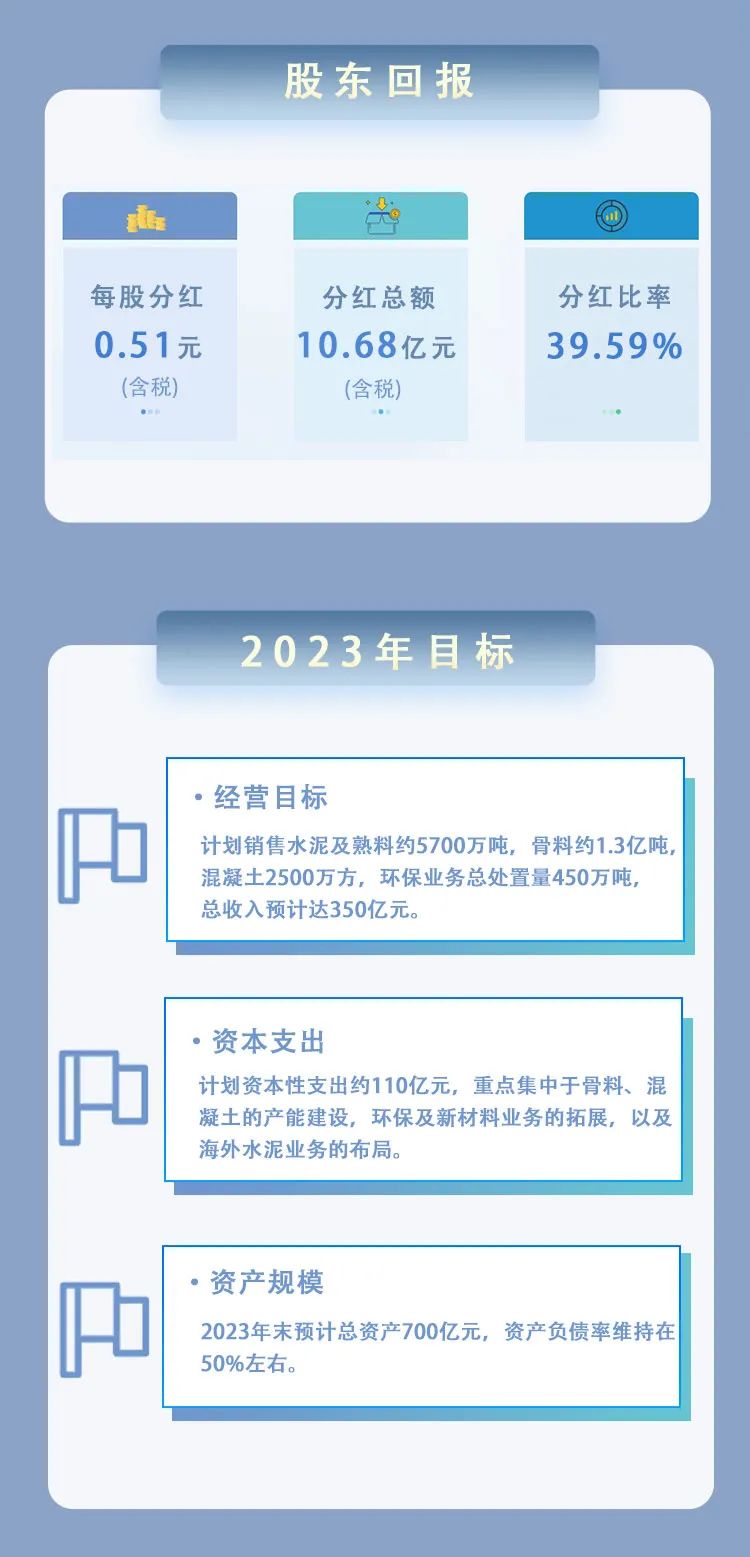 骨料方面,2023年華新水泥計劃銷售骨料約1.3億噸,統籌沿江骨料、混凝土營銷管理,加快市場布局和終端客戶開發,確保銷量目標的完成;持續發展營銷數字化、智能化,不斷提升業務效率和客戶體驗。華新水泥將計劃資本性支出約110億元,重點集中于骨料、混凝土的產能建設,環保及新材料業務的拓展,以及海外水泥業務的布局。