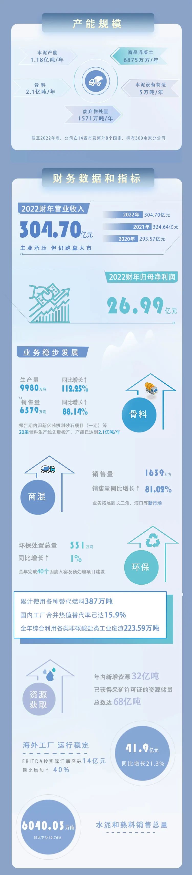 3月28日晚間,華新水泥股份有限公司(簡稱“華新水泥”)發布《2022年度報告》稱,2022年公司實現營業收入304.7億元,同比減少6.14%;凈利潤26.99億元,同比減少49.68%;基本每股收益1.3元。