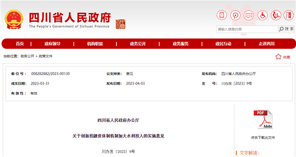 據(jù)了解,該《意見(jiàn)》是繼2023年1月份,中共四川省委、四川省人民政府出臺(tái)的《關(guān)于進(jìn)一步加強(qiáng)水利工程建設(shè)保障經(jīng)濟(jì)社會(huì)高質(zhì)量發(fā)展的意見(jiàn)》后的又一推進(jìn)水利工程建設(shè)的利好政策。