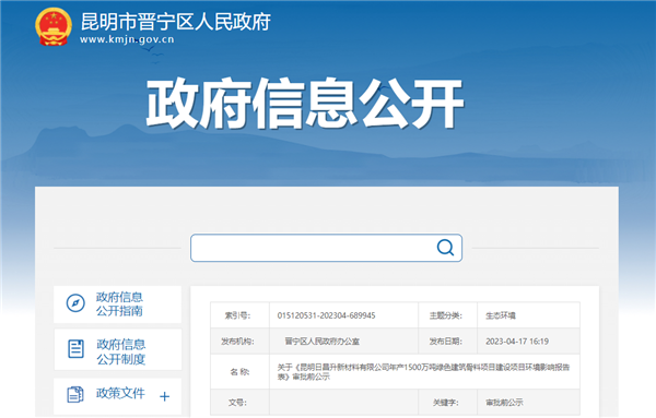 4月17日,云南省昆明市晉寧區(qū)人民政府發(fā)布了昆明日昌升新材料有限公司年產(chǎn)1500萬(wàn)噸骨料項(xiàng)目環(huán)評(píng)公示。該項(xiàng)目總投資15億元,其中生產(chǎn)加工區(qū)投資9.5億元。項(xiàng)目建成后主要生產(chǎn)石粉、機(jī)制砂(0-5mm)、瓜子石(5-15mm)、寸子石(15-25mm)骨料產(chǎn)品。