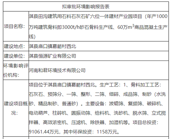 4月17日,河南鶴壁市生態環境局發布擬對淇縣恒源礦業有限公司淇縣田溝建筑用石料石灰石礦六位一體建材產業園項目(年產1000萬噸建筑骨料即時產3000砂石骨料生產線、60萬方商品混凝土生產線)環境影響評價文件作出審批意見的公示。
