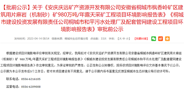4月14日,安徽省桐城市生態環境分局發布《安慶慶遠礦產資源開發有限公司安徽省桐城市楓香嶺礦區建筑用片麻巖(機制砂)礦980萬噸/年露天采礦工程項目環境影響報告表》審批前公示。