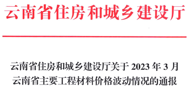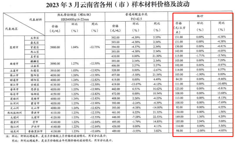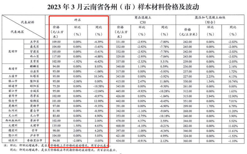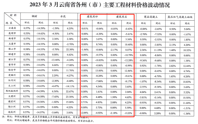 據了解,近日,云南省住房和城鄉建設廳發布關于2023年3月云南省主要工程材料價格波動情況的通報。其中建筑用砂、建筑用石價格指數均保持穩定。其中:粗砂價格最高大理市149元/m³,最低昭通市昭陽區84.2元/m³;碎石價格最高大理市135元/m³,最低75.2元/m³。水泥、商品混凝土價格微降。