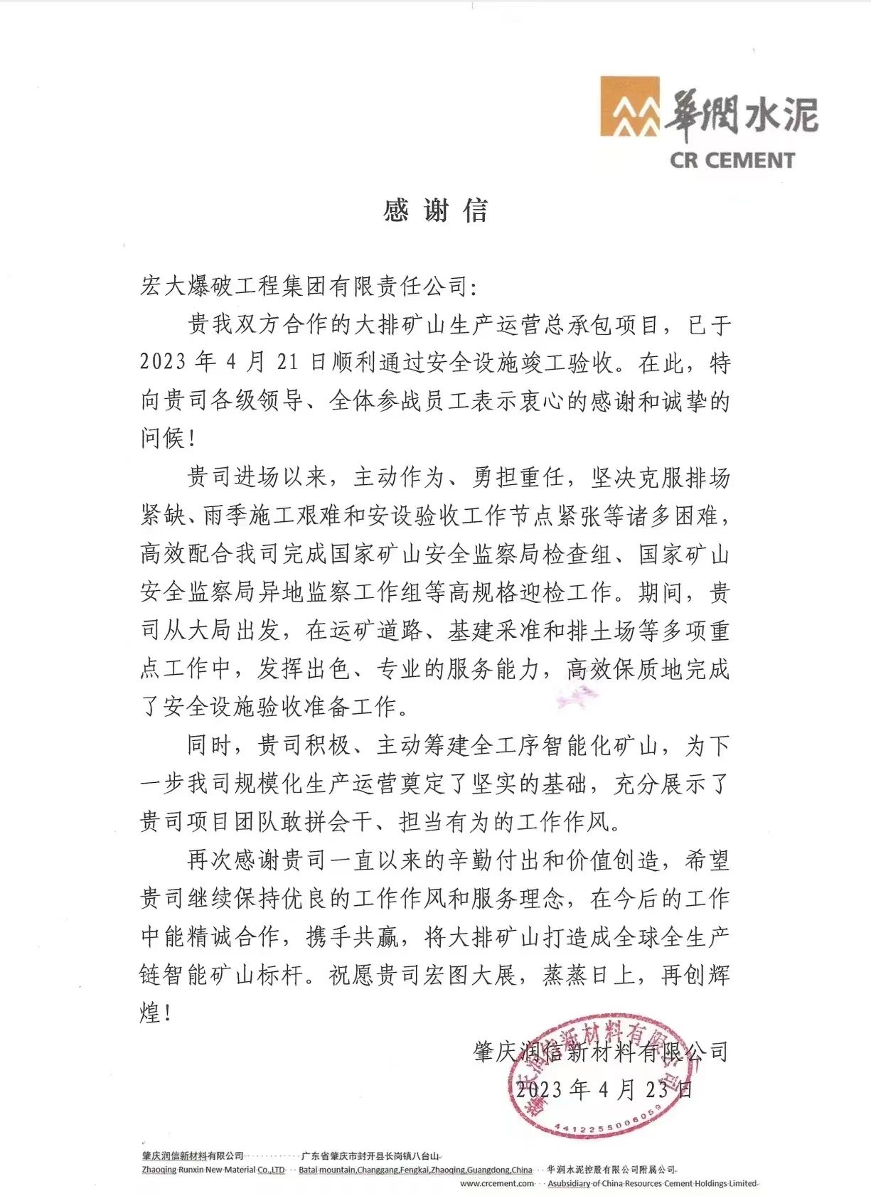 2023 年4月21日,由宏大爆破工程集團有限責任公司生產(chǎn)運營總承包的廣東肇慶封開華潤水泥年產(chǎn)3000萬噸大排砂石骨料礦項目,已順利通過安全設施竣工驗收,據(jù)了解,該項目在6月底前可全系統(tǒng)建成投運。