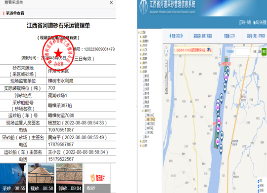 2019年10月,宜春市水利局率先在樟樹實施電子化采運單試點,形成河道砂石開采、運輸、銷售的全程監控一體化 “電子采運管理單”,并于2020年1月份開始試運行,2021年2月正式運行。“現在通過電子化采運單,采砂辦能更準確地掌握每輛采運砂船的采運數據和具體位置,更有針對性地管理開采活動。同時,電子采運單的推行也保障了采運砂數據的真實性和可信性,大幅提高了采砂管理效率。”樟樹市采砂辦主任彭小如說。