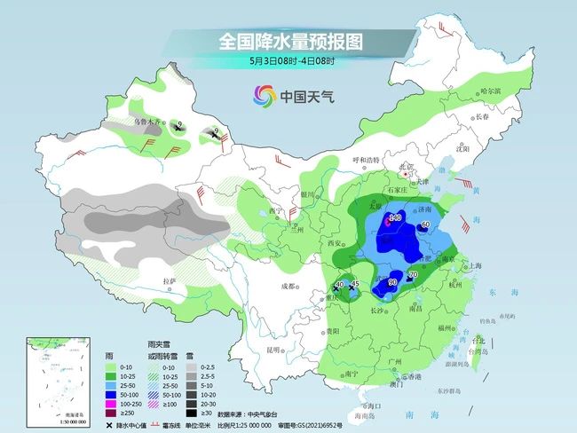 具體來看,3日,新疆沿天山地區、青海南部、西藏西部和北部部分地區有小到中雪或雨夾雪。其中,新疆沿天山地區局地有大雪(5~9毫米);華北南部、黃淮、江淮大部、江漢大部、重慶東北部等地部分地區有中到大雨,其中,山東西部、河南中東部、安徽北部、湖北東部等地部分地區有暴雨或大暴雨(100~140毫米)。