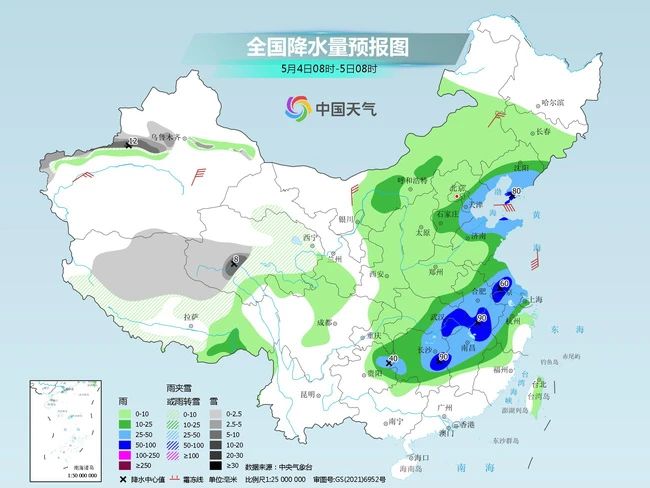 4日,新疆沿天山地區、西藏北部和西部、青海東部和南部等地部分地區有小到中雪或雨夾雪。其中,新疆沿天山地區、青海南部等地部分地區有大到暴雪(10~12毫米);內蒙古河套地區、東北地區南部、華北東部、黃淮東部、江淮大部、江漢東部、江南大部、貴州東部等地部分地區有中到大雨,其中,遼東半島、安徽中南部、江蘇中南部、湖北東部、湖南東部、江西北部和西部等地部分地區有暴雨(50~90毫米)。
