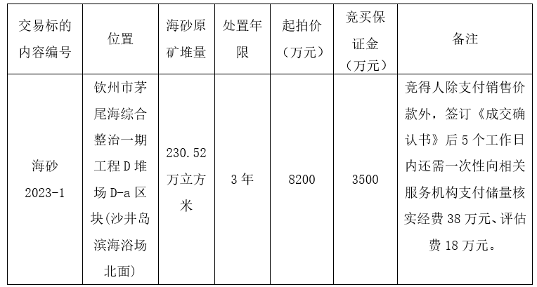 從廣西欽州市自然資源局獲悉,2023年5月11日16時欽州市自然資源交易中心聯合廣西企赫拍賣有限責任公司拍賣一宗海砂。該海砂位于欽州市茅尾海綜合整治一期工程D堆場D-a區塊(沙井島濱海浴場北面),海砂原