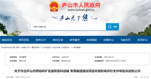 根據公告,此次獲批的廊道項目橫跨廬山市溫泉鎮、星子鎮,起點在西牯嶺花崗巖礦加工區成品堆場附近,終點在鄱湖綜合碼頭,廊道總長度6159米,其中地埋式長度4500m,架空廊道1659m。項目主要由主體工程、臨時工程、公用工程和環保工程組成,具體由廊道工程(地下、半地下)、彩虹橋、支架、棧橋、轉運站、公用工程等組成。