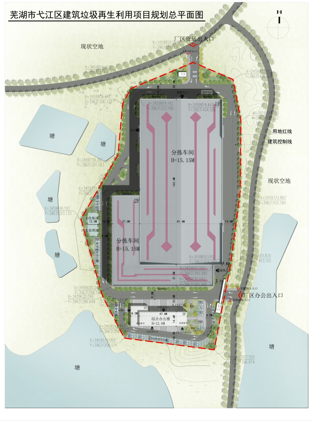 弋江區(qū)建筑垃圾再利用項(xiàng)目位于九華南路西側(cè)、高鐵南站東側(cè),占地面積約50畝,根據(jù)設(shè)計(jì)圖顯示,項(xiàng)目包括分揀車(chē)間、綜合辦公樓,總用地面積33160平方米新建廠房及辦公樓,總建筑面積23846.23平方米,計(jì)容總建筑面積50121.35平方米。