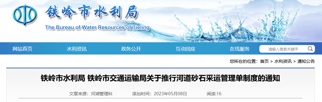 2023年1月,水利部和交通運輸部聯合發布《水利部 交通運輸部關于推行河道砂石采運管理單制度的通知》,決定在全國推行河道砂石采運管理單制度。近日,遼寧省鐵嶺市水利局、鐵嶺市交通運輸局發布關于推行河道采砂管理單制度的通知。