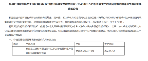 5月12日,河北易縣行政審批局對易縣京蘭建材有限公司400萬t/a砂石骨料生產線項目環境影響評價文件作出審批決定。該決定意味著河北市場每年將新增400萬噸砂石供應!