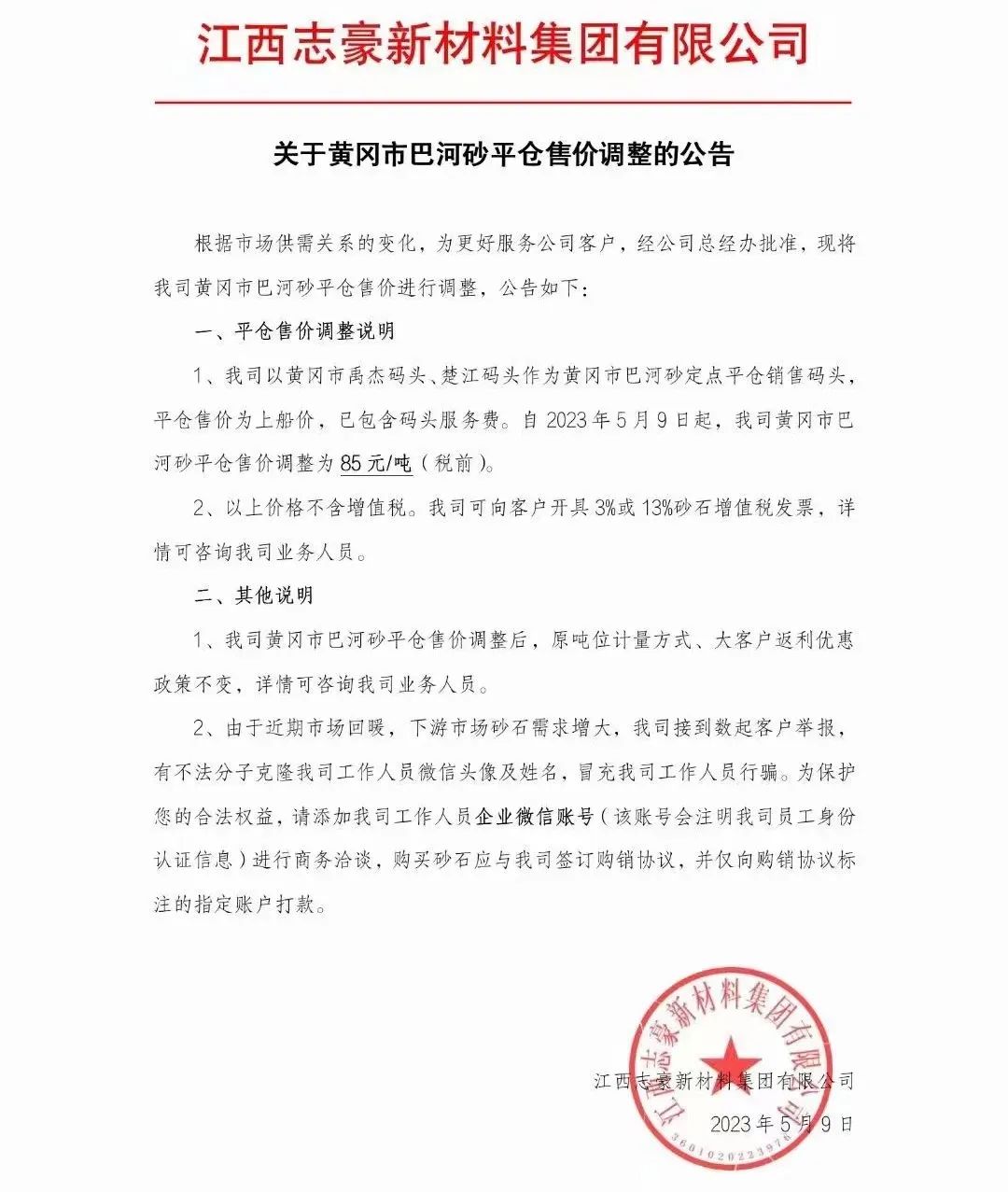 近日,江西志豪新材料集團有限公司發布該司黃岡市巴河砂平倉售價調整的公告。自2023年5月9日起,江西志豪新材料集團有限公司黃岡市巴河砂平倉售價調整為85元/噸(稅前)。