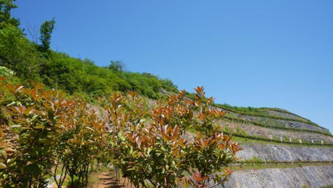 在江蘇信寧新型建材有限公司所屬生態礦區,邊坡臺階層層壘疊,礦山腳下種著綠樹。(資料圖 )
