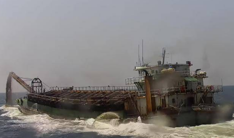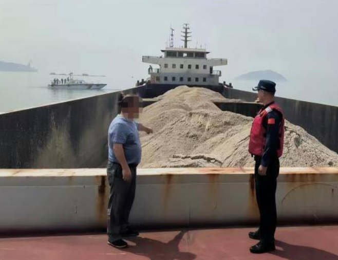 福州海警局執法艇在黑巖島附近海域巡邏時發現1艘裝載有大量砂子的作業船。該船吃水較深,且未開啟AIS等通導設備,形跡十分可疑。海警執法員立即驅船靠近,通過喊話亮明身份,要求其停止作業并停船受檢。該船發現海警執法艇后,立即轉向加速逃竄,同時進行卸砂作業,企圖銷毀證據。