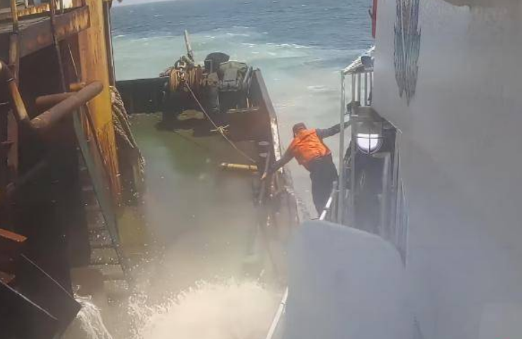 在多次警告無果后,海警執法員克服不良海況影響,駕駛執法艇進行強行靠幫跳幫,成功控制嫌疑船及人員。經查,該船載有海砂約2000噸,且人員均無法提供相關手續,涉嫌非法盜采運輸海砂。