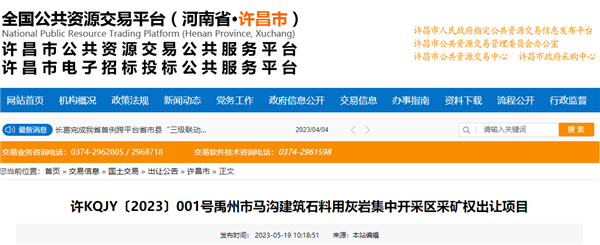 日前,河南省許昌市公共資源交易平臺發布了禹州市馬溝建筑石料用灰巖集中開采區采礦權招標出讓公告。本次出讓的砂石集中開采區資源儲量26143.3萬噸(2.6億噸),開采規模1500萬噸/年,擬出讓年限17年(包含基建期1.5年),起始價為70477.8萬元(7億元)。