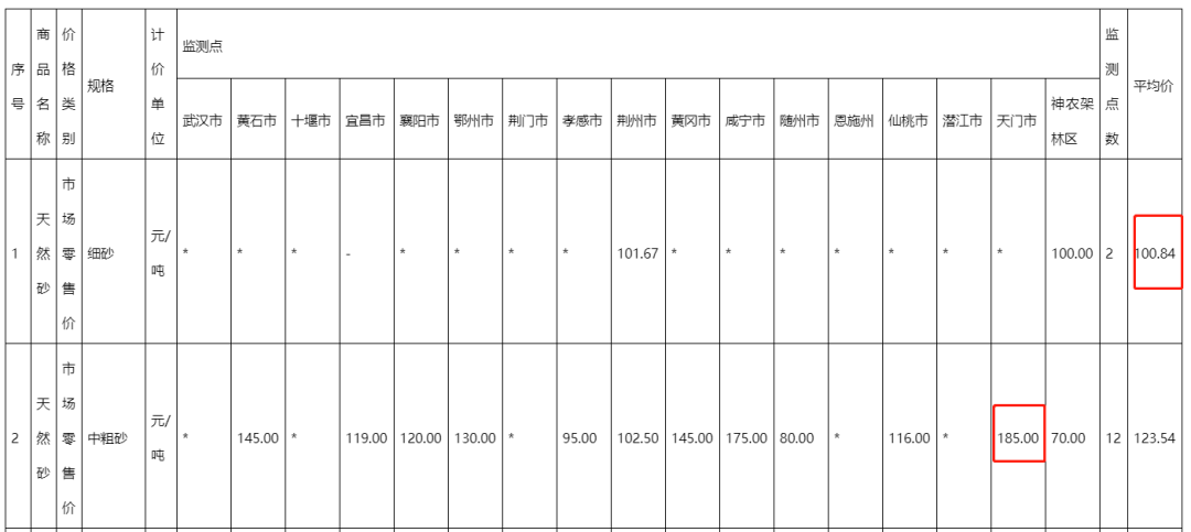 天然砂(中粗砂)天門市價格最高達185元/噸;神農架林區價格最低70元/噸。