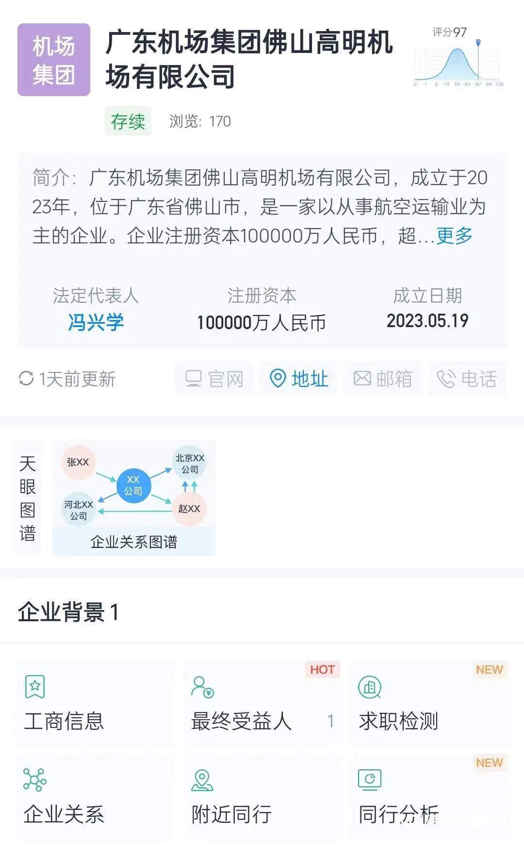 據天眼查,廣東機場集團佛山高明機場有限公司是一家從事航空運輸業為主的企業,法人代表為馮興學,經營許可項目包括民用機場運營;建設工程施工、保稅倉庫經營、住宿服務、民用航空器零部件設計和生產、房地產開發經營等等。