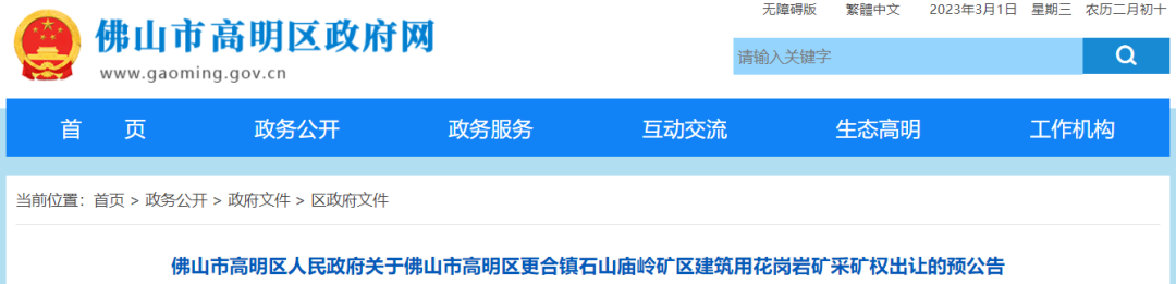 為穩定建筑石料供應,支撐重大工程建設,佛山市高明區人民政府將于近期通過網上掛牌方式出讓佛山市高明區更合鎮石山廟嶺礦區建筑用花崗巖礦采礦權。為方便潛在競買人更好地了解礦山信息,提前做好投資計劃,佛山市高明區人民政府發布《預公告》。