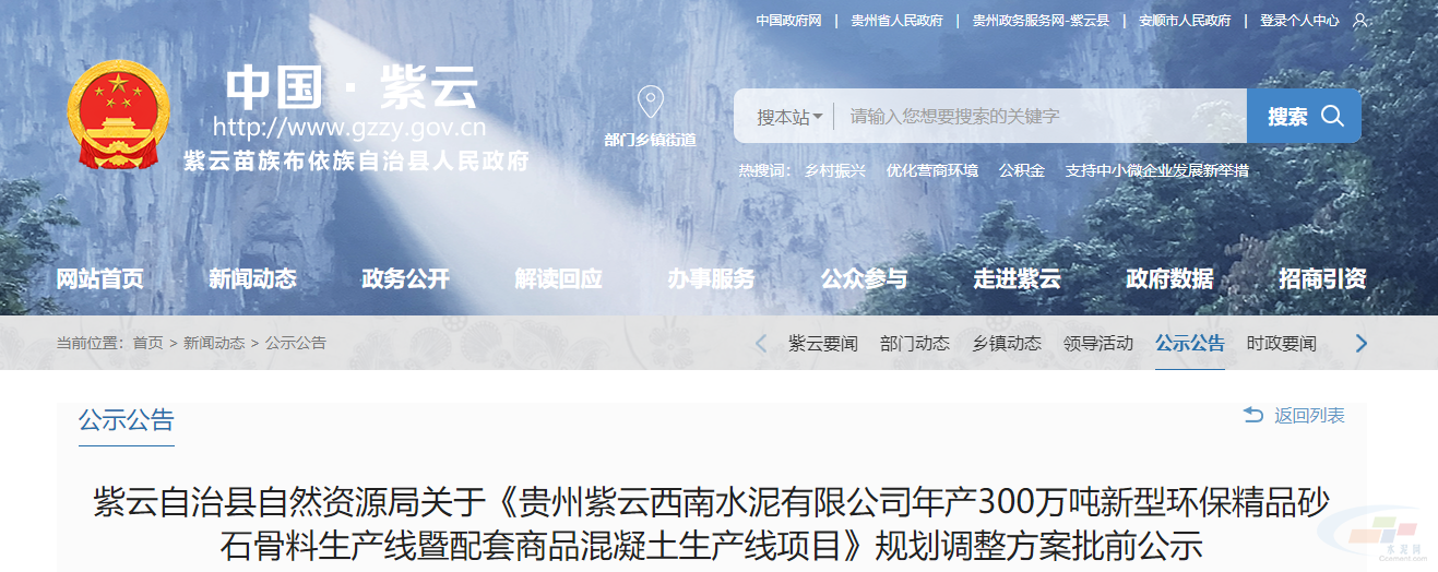 近日,貴州省紫云自治縣自然資源局發布關于《貴州紫云西南水泥有限公司年產300萬噸新型環保精品砂石骨料生產線暨配套商品混凝土生產線項目》規劃調整方案批前公示。全文如下: