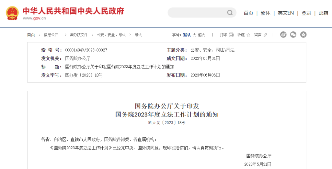 《國務院2023年度立法工作計劃》已經黨中央、國務院同意,現印發給你們,請認真貫徹執行。