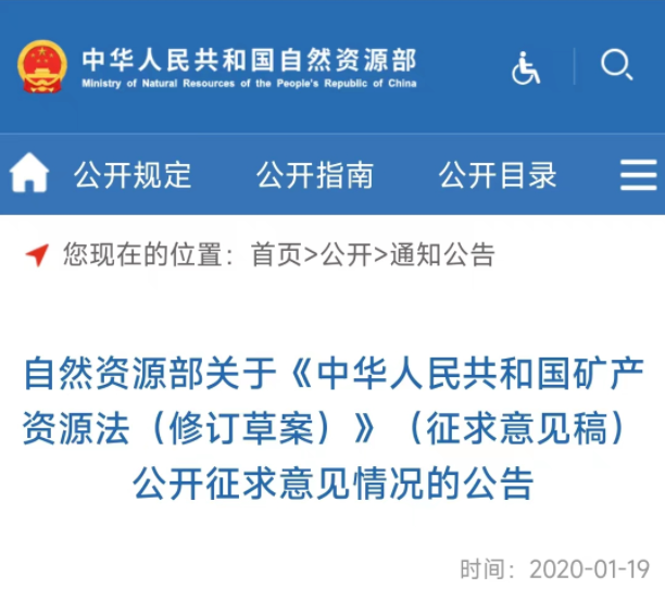 2019年12月17日至2020年1月15日期間,根據十三屆全國人大常委會立法規劃要求,自然資源部起草了《中華人民共和國礦產資源法(修訂草案)》(征求意見稿)向社會公開征求意見。2020年1月,自然資源部發布了關于《中華人民共和國礦產資源法(修訂草案)》(征求意見稿)公開征求意見情況的公告,征集到社會各界對于《中華人民共和國礦產資源法(修訂草案)》在礦業權出讓轉讓、探礦權轉采礦權、生活和工程自用、壓覆礦產資源、礦區生態修復、法律責任等方面的意見。