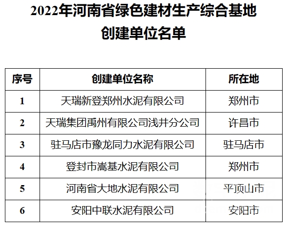 近期,河南省工信廳發布《關于2022年河南省綠色建材生產綜合基地創建單位名單的公示》,《公示》內容顯示,天瑞新登鄭州水泥等6家企業入選名單。