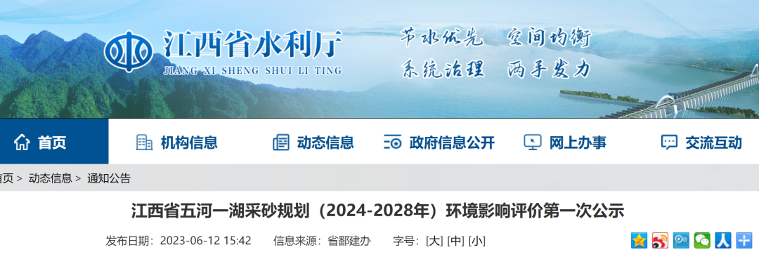 江西省五河一湖采砂規劃(2024-2028年)環境影響評價第一次公示根據《規劃環境影響評價條例》(國務院令第 559 號)、《環境影響評價公眾參與辦法》(生態環境部第 4 號令)等相關規定,現將《江西省五河一湖采砂規劃(2024-2028年)環境影響評價》有關事項公示如下: