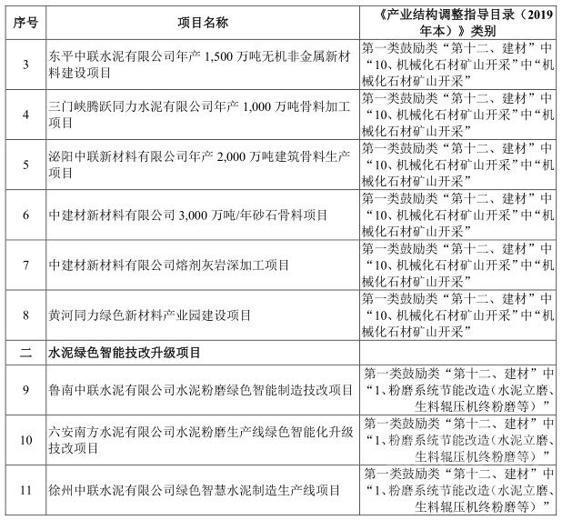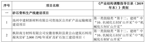 本次募投項目中砂石骨料項目、活性石灰項目符合《產業結構調整指導目錄(2019年本)》第一類鼓勵類“第十二、建材”中“10、機械化石材礦山開采”中“機械化石材礦山開采”的范疇,為鼓勵類項目;本次募投項目中水泥綠色智能技改升級項目符合《產業結構調整指導目錄(2019 年本)》第一類鼓勵類“第十二、建材”中“1、粉磨系統節能改造(水泥立磨、生料輥壓機終粉磨等)”,均是對原有水泥粉磨生產線進行綠色智能化技術改造或擴建,采取先進工藝,能夠有效降低能耗、減少污染,同樣為鼓勵類項目。因此,本次募投項目均投向《產業結構調整指導目錄(2019 年本)》的“鼓勵類”領域,不涉及限制類、淘汰類項目,不存在需要取得主管部門意見的情形。