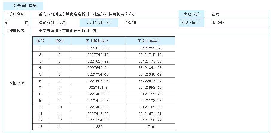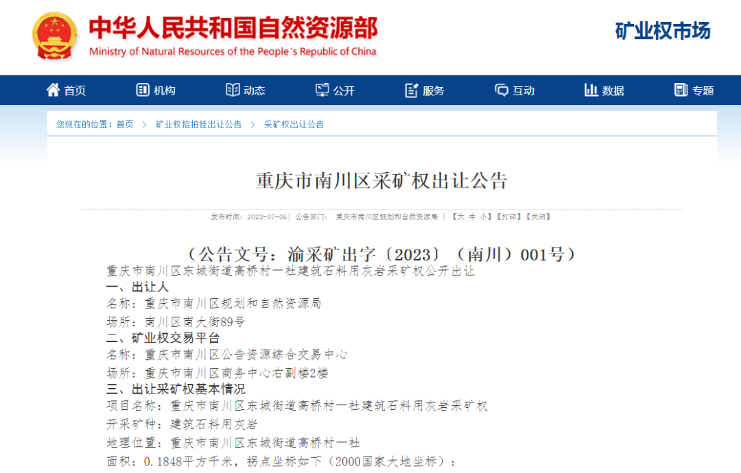 7月6日,重慶市南川區規劃和自然資源局發布公告,掛牌出讓重慶市南川區東城街道高橋村一社建筑石料用灰巖采礦權,擬出讓18.7年,起始價6783.4萬元。
