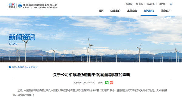 據(jù)了解,中能建葛洲壩集團(tuán)不是第一家被不法分子冒用旗號(hào)的公司。此前,中電建旗下子公司汕尾建材公司曾發(fā)布過一則《關(guān)于不法分子冒用我公司名義虛假開立賬戶的嚴(yán)正聲明》。