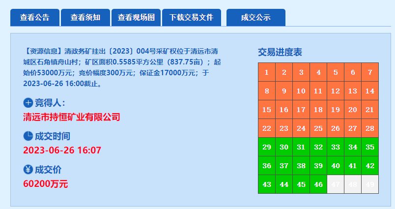 2023年6月26日,清遠市泓遠礦業有限公司以78300萬元競得廣東清遠市清城區源潭鎮青龍深木窿建筑用花崗巖礦。礦區范圍內,建筑用花崗巖礦資源儲量6974.84萬方,生產規模300萬方/年,出讓年限21年8個月(含基建期)。