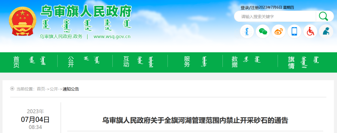 為充分發揮社會監督作用,嚴厲打擊河道非法采砂行為,根據《中華人民共和國水法》《中華人民共和國黃河保護法》《中華人民共和國河道管理條例》《內蒙古自治區河湖保護和管理條例》《鄂爾多斯市黃河河道管理條例》等法律法規,結合烏審旗實際,現就我旗全域河湖管理范圍內禁止開采砂石通告如下: