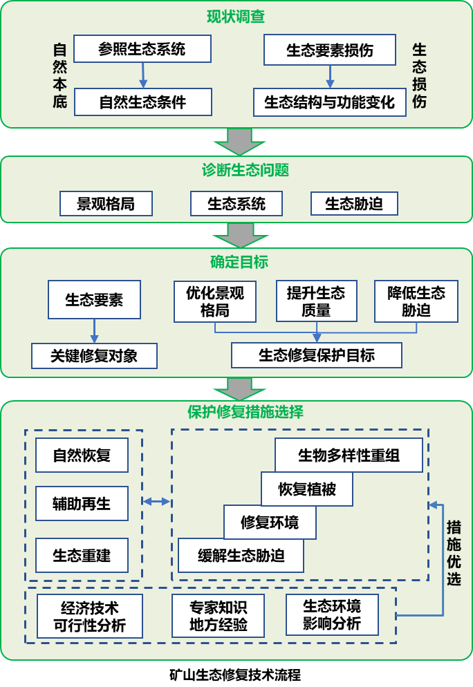 (1)將因礦山開采活動受損生態系統恢復到接近于采礦前的自然生態環境;(2)重建成符合人們某種特定用途的生態環境;(3)恢復成與周圍環境(景觀)相協調的其他生態環境。