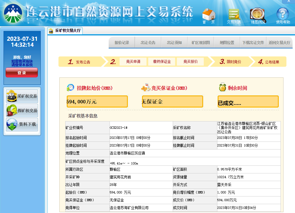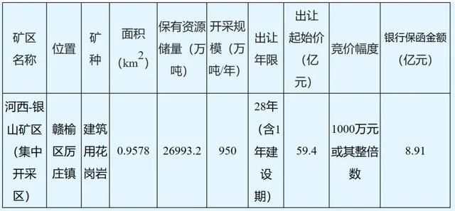 近日,連云港市國有建設用地使用權和礦業權網上交易系統掛牌出讓江蘇省連云港市贛榆區河西-銀山礦區(集中開采區)建筑用花崗巖礦采礦權,該礦位于連云港市贛榆區厲莊鎮,礦區面積0.9578平方千米,資源儲量10224.7萬立方米,開采規模950萬噸/年,出讓年限28年(含1年建設期),成交價為59.4億元。競得公司為連云港蘇海礦業有限公司!