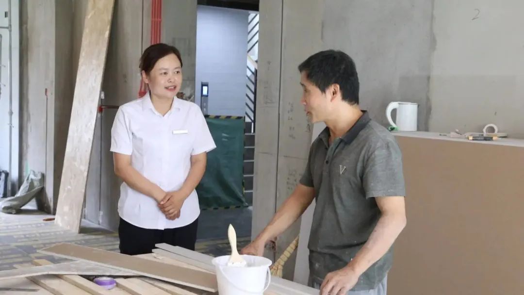 在九曲街道奧德海棠小區(qū)的一戶居民家里,小區(qū)物業(yè)人員正在上門對(duì)裝修工人進(jìn)行裝修垃圾分類宣傳,引導(dǎo)他們做好裝修垃圾的分類收集和定點(diǎn)投放。