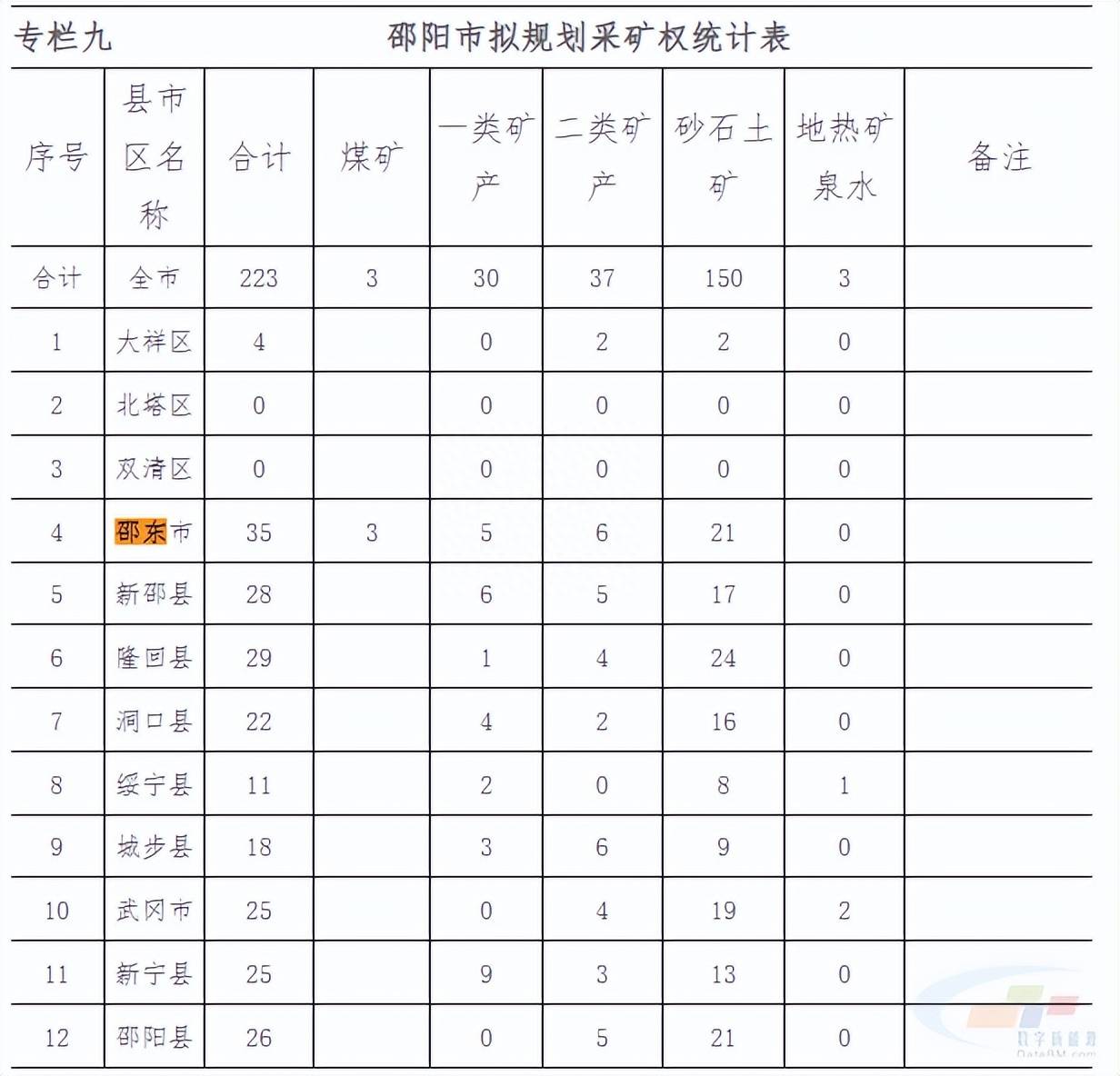 《邵陽市礦產(chǎn)資源總體規(guī)劃(2021~2025年)》指出,至2025年規(guī)劃期末,邵東市擬規(guī)劃35個采礦權(quán),其中煤礦3個,一類礦產(chǎn)5個,二類礦產(chǎn)6個,