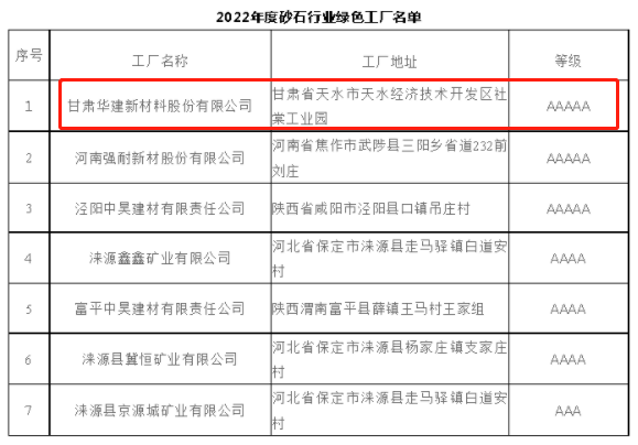 根據(jù)《全國(guó)砂石及裝備企業(yè)綠色工廠認(rèn)定管理辦法》的規(guī)定,經(jīng)企業(yè)申報(bào)、第三方評(píng)價(jià)、評(píng)審委員會(huì)評(píng)審、評(píng)審公示及中國(guó)砂石協(xié)會(huì)認(rèn)定等程序,中國(guó)砂石協(xié)會(huì)副會(huì)長(zhǎng)單位甘肅華建新材料股份有限公司獲得“砂石行業(yè)綠色工廠”稱(chēng)號(hào),并取得AAAAA等級(jí)。