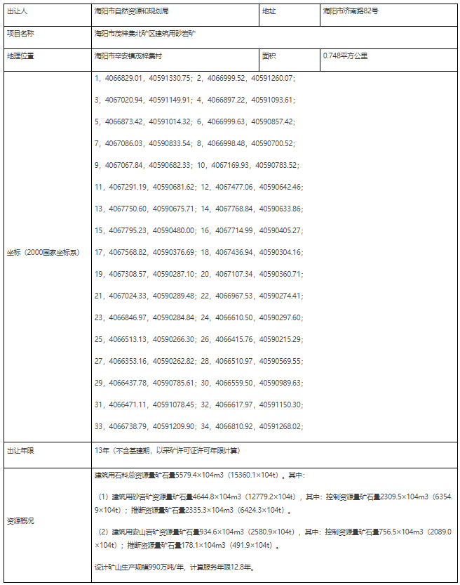 8月16日,山東海陽市自然資源局發(fā)布一建筑用砂巖礦掛牌出讓公告。該礦資源儲(chǔ)量超1.5億噸,設(shè)計(jì)年生產(chǎn)規(guī)模990萬噸,出讓13年,30400萬元(3.04億元)起拍,約2元/噸。