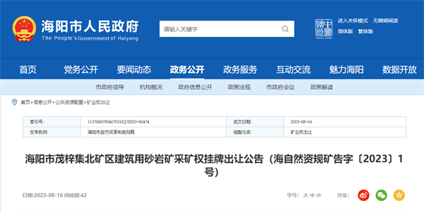 根據(jù)《中華人民共和國民法典》、《中華人民共和國礦產(chǎn)資源法》、《中華人民共和國電子簽名法》、《礦業(yè)權(quán)交易規(guī)則》、《山東省礦業(yè)權(quán)網(wǎng)上交易規(guī)則》等有關(guān)規(guī)定,海陽市自然資源和規(guī)劃局?jǐn)M對(duì)海陽市茂梓集北礦區(qū)建筑用砂巖礦采礦權(quán)進(jìn)行網(wǎng)上掛牌出讓。現(xiàn)將有關(guān)事項(xiàng)公告如下: